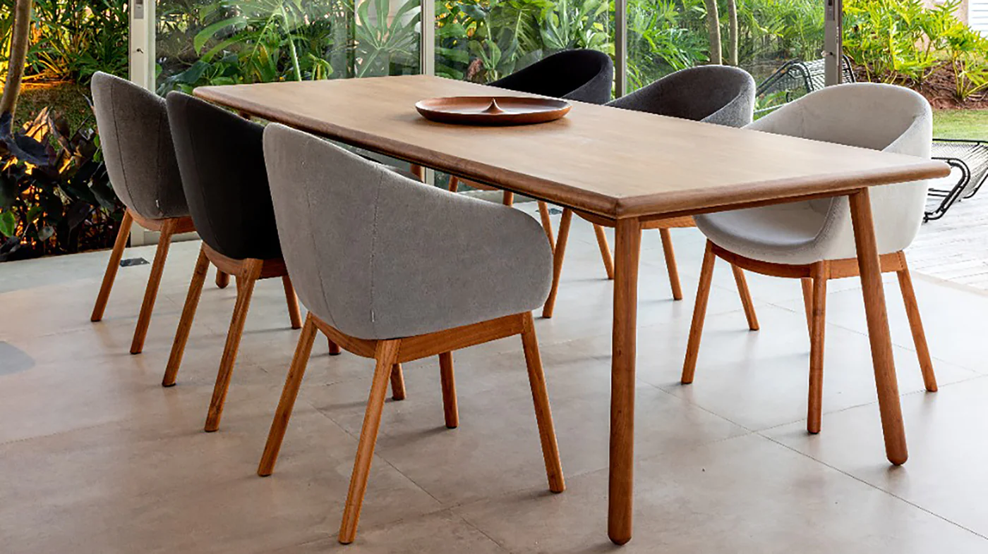 With its solid (freijo) wood structure and upholstered seat and back, the Barca chair, remarkably comfortable with its organic, soft-lined design, is formed by two main elements: its base, made out of solid freijo with light and elegant contours of weel-thrown wood, and its shell, shaped in fiberglass and stuffed.
