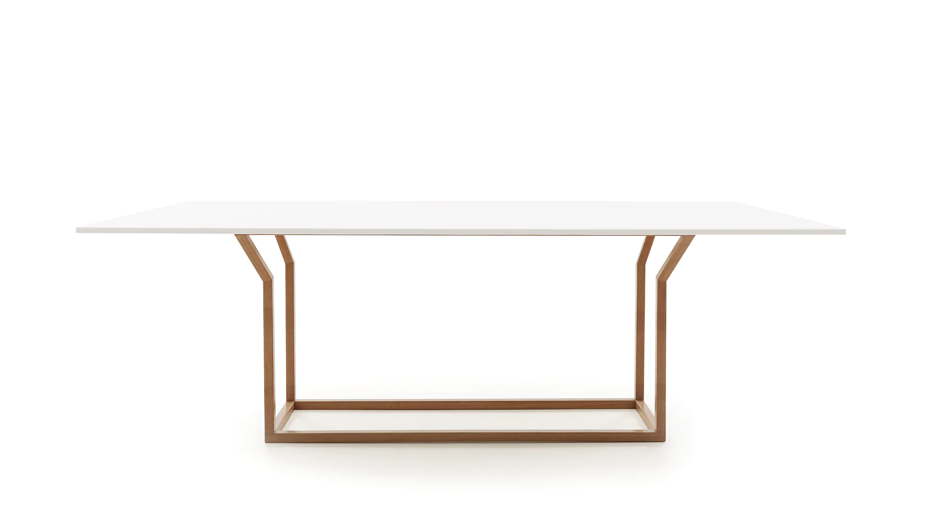 Something to be highlighted about the Voo table is its graphical aspect. The title emphasizes the design. Its as if the top was detaching itself from the base. This piece has a wooden (jequitibá) laminated metallic base and a Nanoglass top. Other materials are also available.