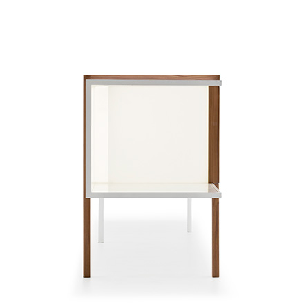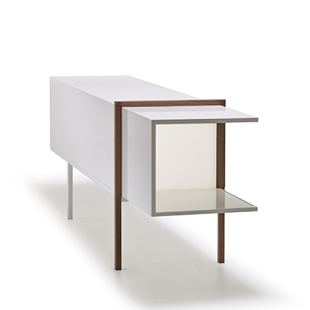 Ara é um aparador feito de madeira laqueada branca, planos de acrílico, uma linha de madeira (nogueira) e luz. Seu jogo de linhas horizontais e verticais remete aos volumes da arquitetura tradicional japonesa, aqui ressignificados pela desconstrução assimétrica dos planos e dos pés. A luz interna, embutida no plano do fundo do móvel, lhe confere leveza transformando-o em uma espécie de “móvel-objeto”.