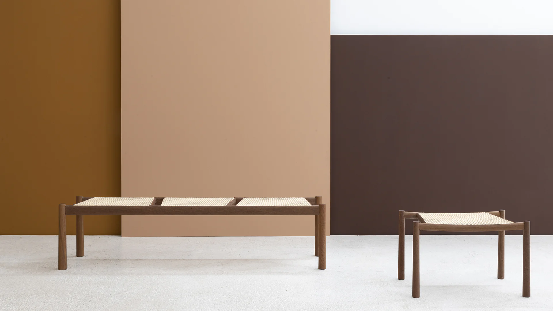 O vão livre que se constitui entre os quatros pés confere leveza e interesse ao banco, evidenciando o plano do assento, que flutua entre as quatro linhas verticais. Tramado em palha com padrão característico e particular, o assento convida o olhar, ao mesmo tempo que oferece apoio confortável ao corpo.