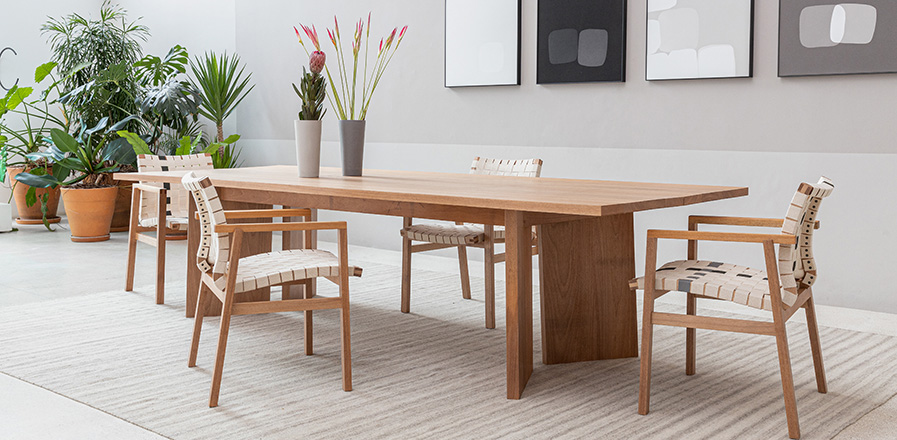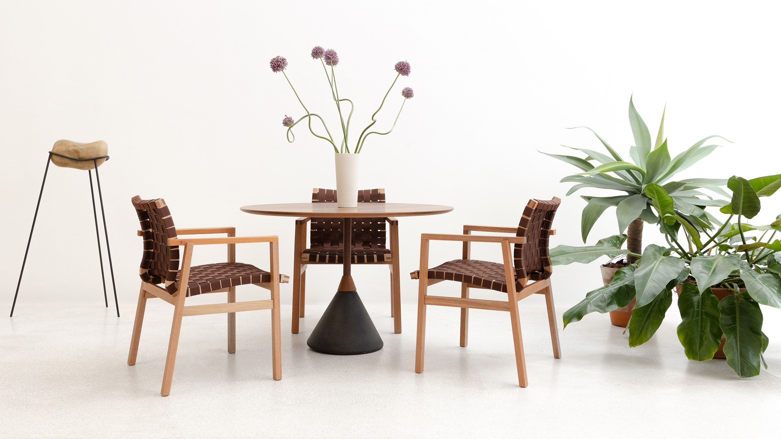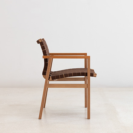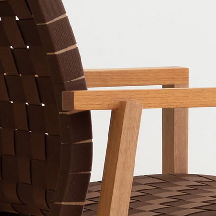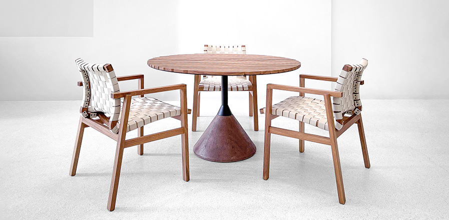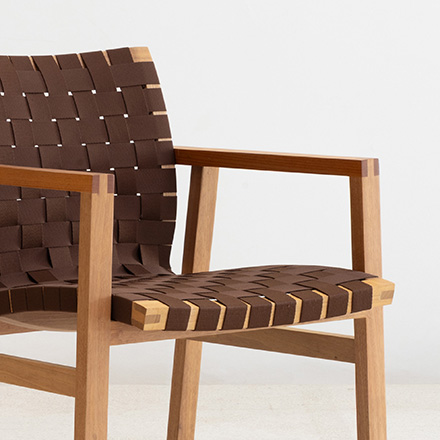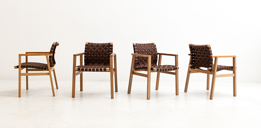 A cadeira Compasso deriva da poltrona de mesmo nome e traz muitas das características que marcam a assinatura da dupla, como a precisão dos traços, o trabalho cuidadoso nas proporções e a clareza do pensamento construtivo. O desenho é formado pela estrutura de traços geométricos, sobre a qual se apoia a concha do assento. Essa recebe um tramado de percintas e é mais sinuosa, fazendo um contraponto com o desenho retilíneo dos pés e braços, e garantindo o conforto. Toda a estrutura é feita de Jequitibá maciço, e a peça também pode ser feita em outras madeiras – Sucupira ou Cumarú. A linha Compasso é oferecida em versões para área interna e externa.