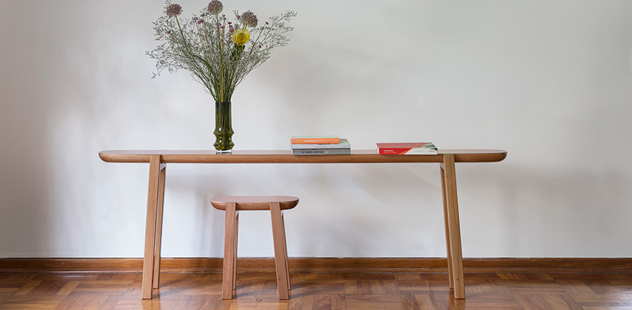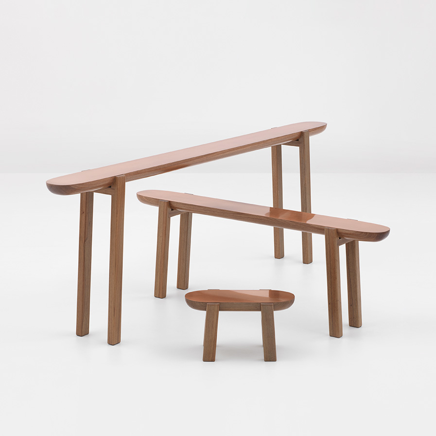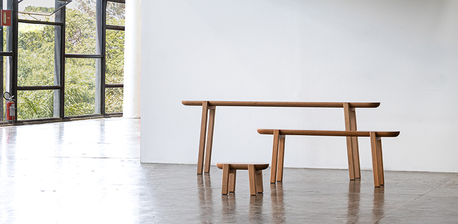 Série de bancos de alturas e comprimentos diferentes feitos de madeira maciça (jequitibá) e cobre. Estas peças apresentam a versão dos designers para uma tipologia muito presente na história do mobiliário brasileiro, o banco vernacular de fazenda.
