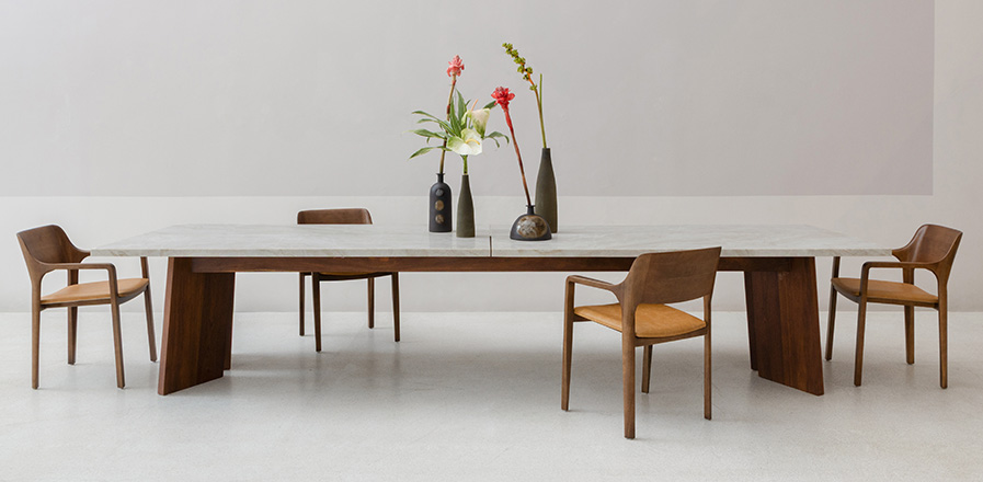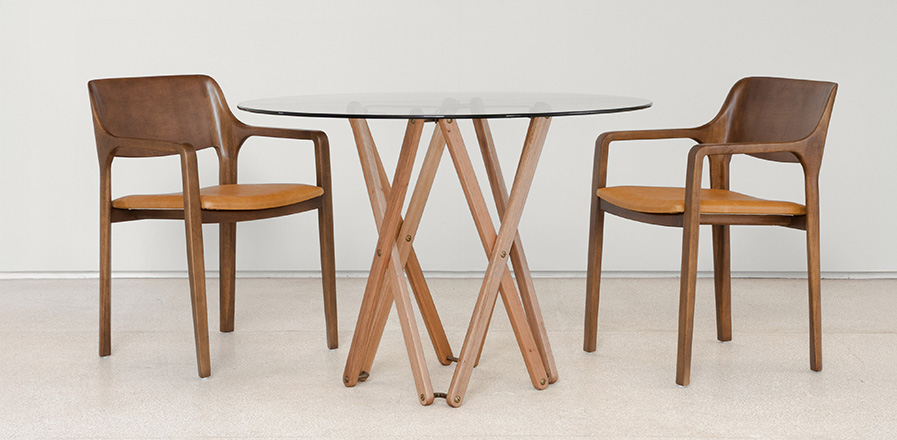 A principal característica da linha Clave é o seu traço orgânico. A cadeira, assim como o pé da mesa, apresenta linhas fluidas que são obtidas pela modelagem da madeira maciça (tauari) em CNC (equipamento de alta tecnologia de Controle Numérico Computadorizado) de 5 eixos, que permite esculpir o bloco bruto e chegar a volumes extremamente leves.