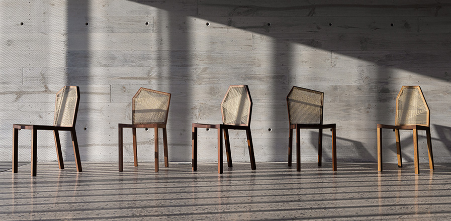 O encosto é o elemento chave da cadeira Dança: um quadro em formato de hexágono irregular serve de moldura para a trama de palha, cujas intersecções e sobreposições formam desenhos que vão das áreas mais adensadas do centro às mais abertas das bordas, subvertendo o padrão ortogonal de trama e urdidura. O conjunto é formado por diferentes formatos de encostos, reforçando a principal característica da série: uma dança de linhas e planos em que o nosso olho parece não pousar.