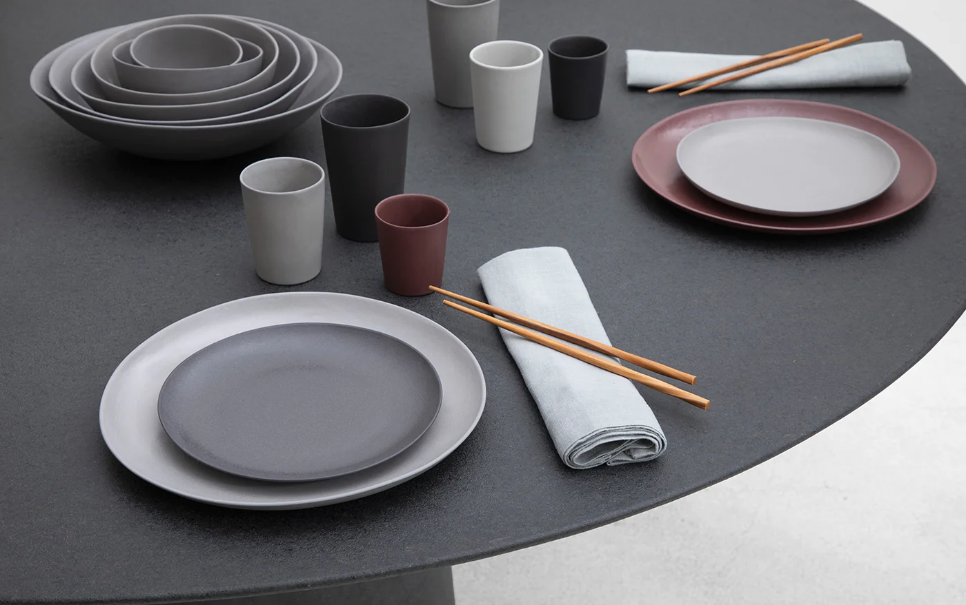 Os pratos Luni estão disponíveis em 2 tamanhos – jantar (G) e sobremesa (P), e nas 9 cores da nossa paleta de porcelana. Os pratos da série Luni, assim como os bowls Deslize e copos, vaso e cachepôes da linha Sílaba, são resultado da colaboração com a ceramista Nydia Rocha.