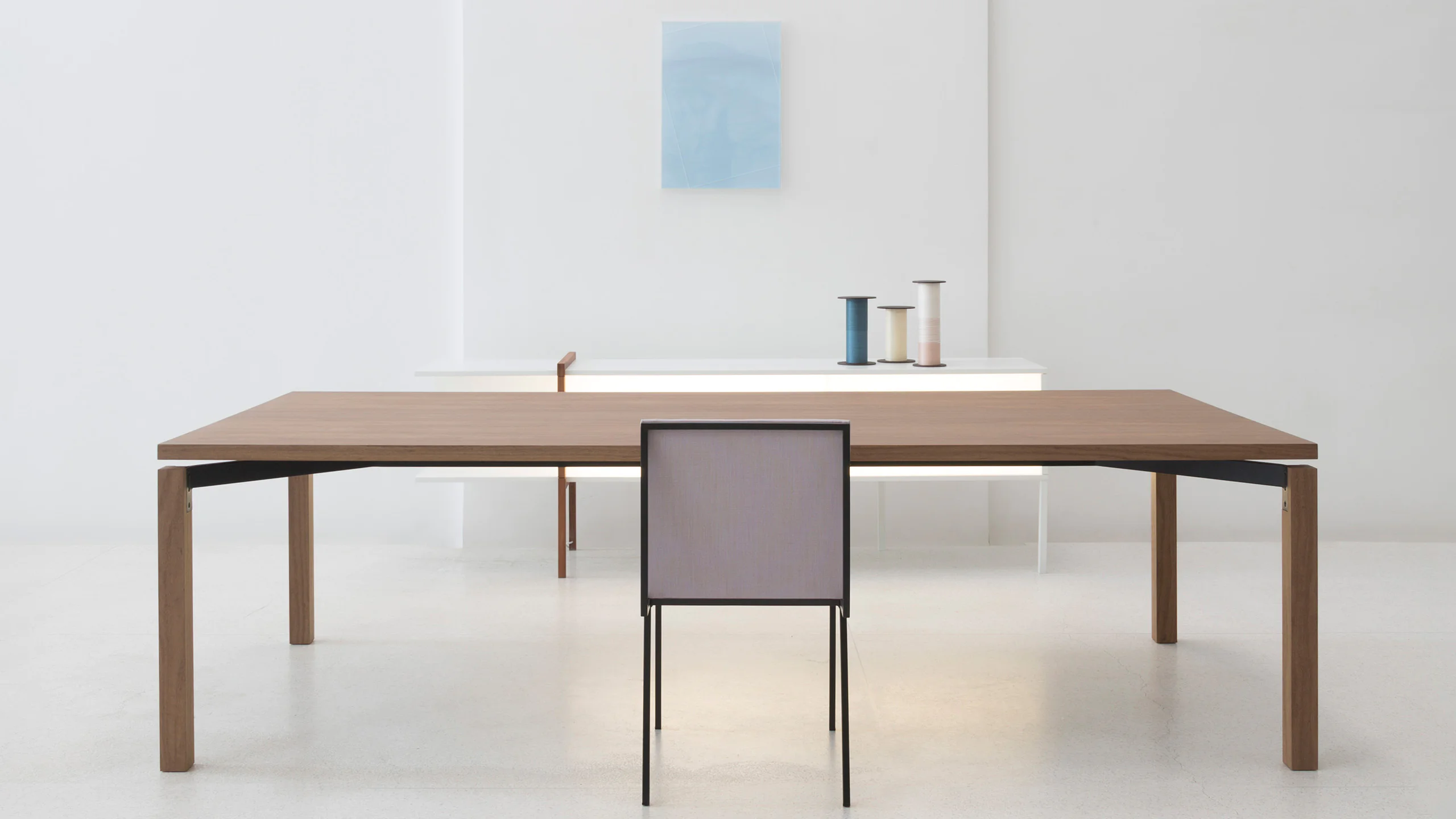 De aço e madeira (catuaba), o desenho conciso remete a estruturas arquitetônicas. O tampo se apoia na base de forma que parece flutuar.